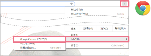画面右上に「:」がある場合は、GoogleChromeを利用しています。また、「:」をクリックし、[ヘルプ – Google Chromeについて]の表示がある場合は、インターネットを接続する際に、 Google Chromeを利用しているため、以下の手順にて履歴のクリアをしましょう。