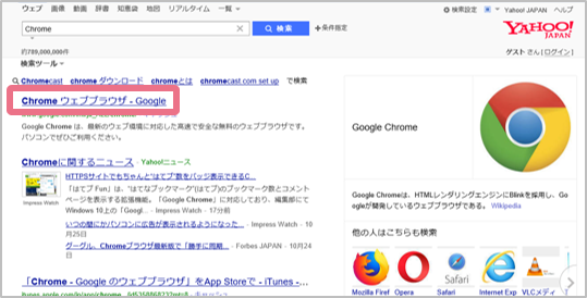 ① インターネットの検索画面にて「Chrome」と入力をして検索します。検索結果の中から「Chrome ウェブブラウザ - Google」を選択します。